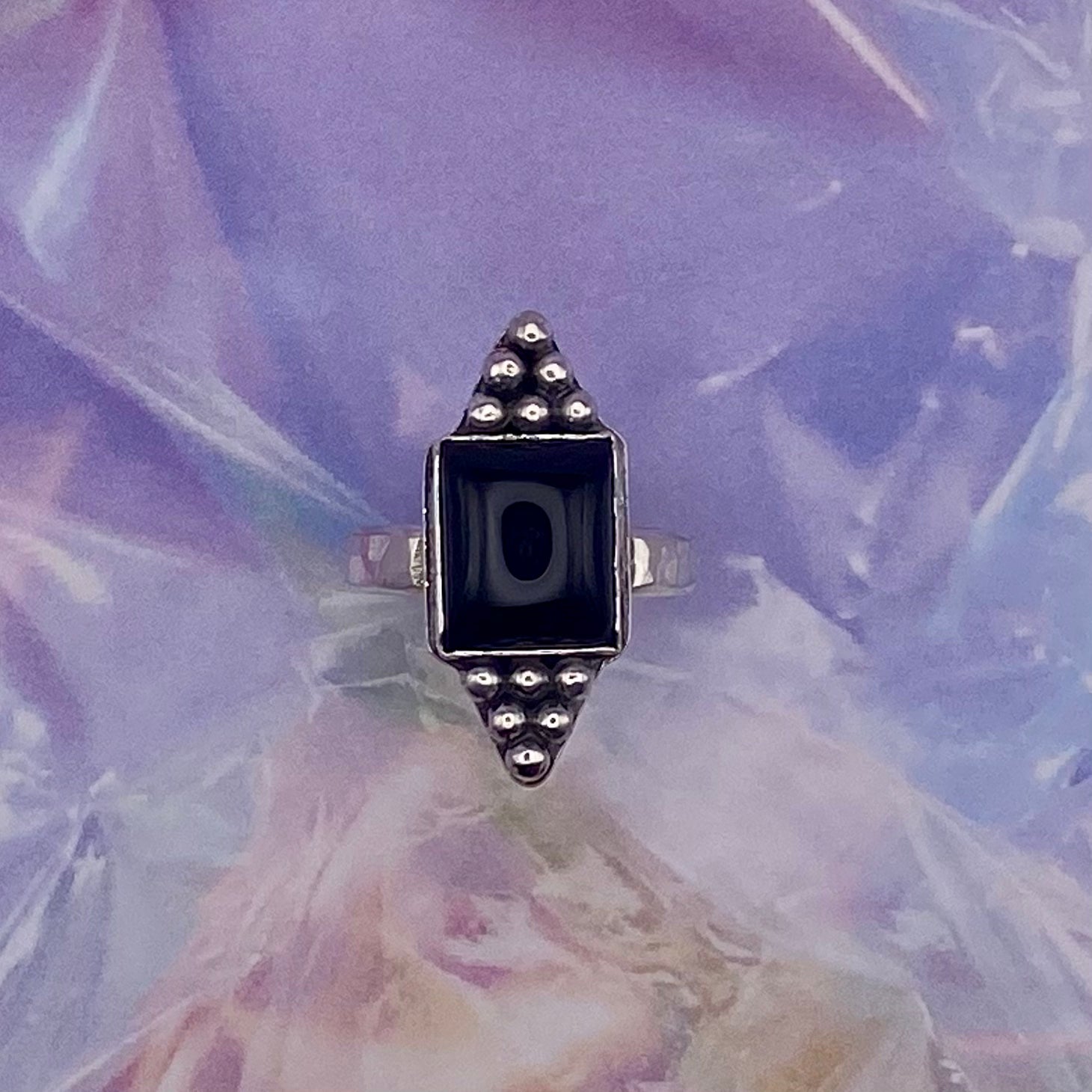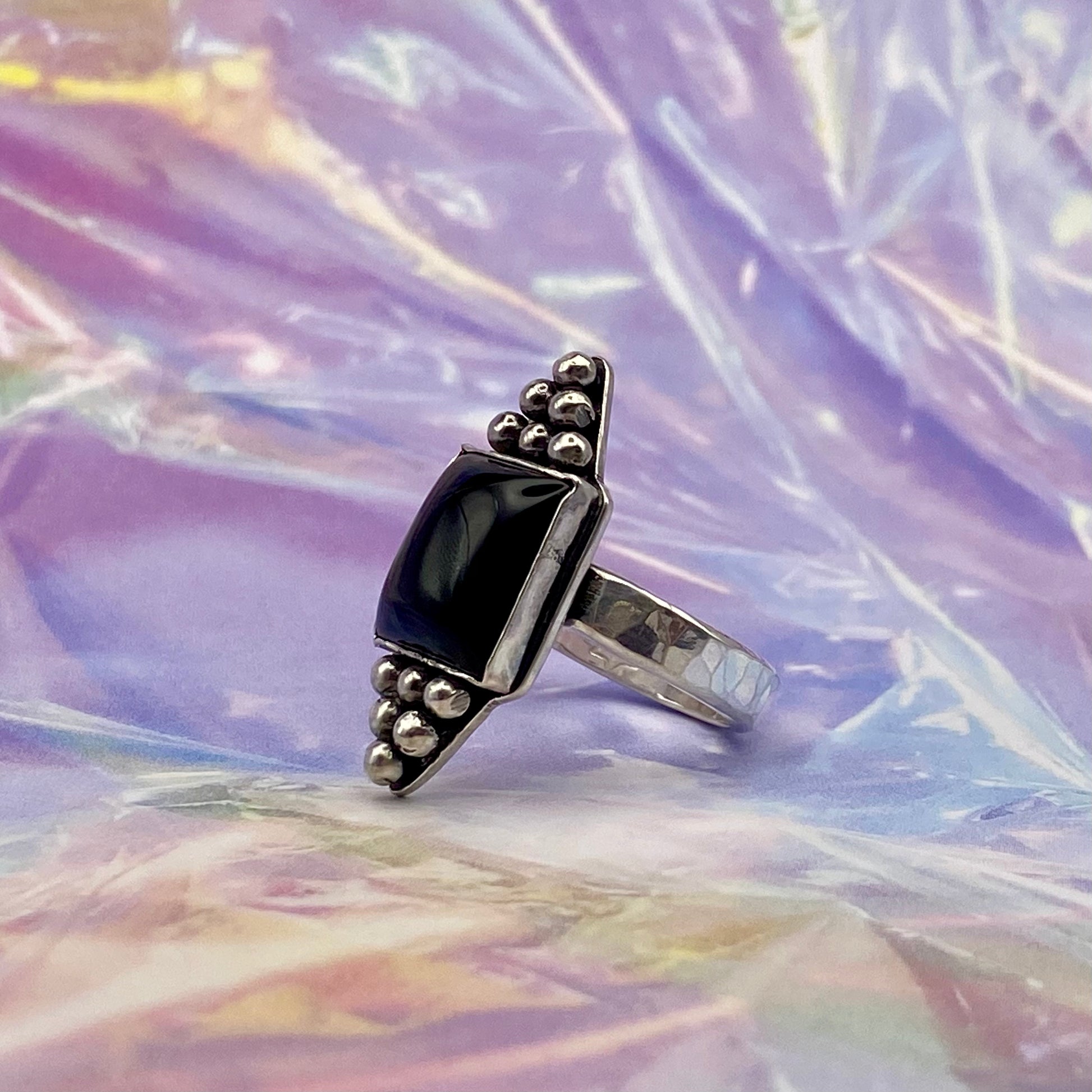 Handcrafted sterling silver ring with 12x10mm black onyx stone and hammered band.